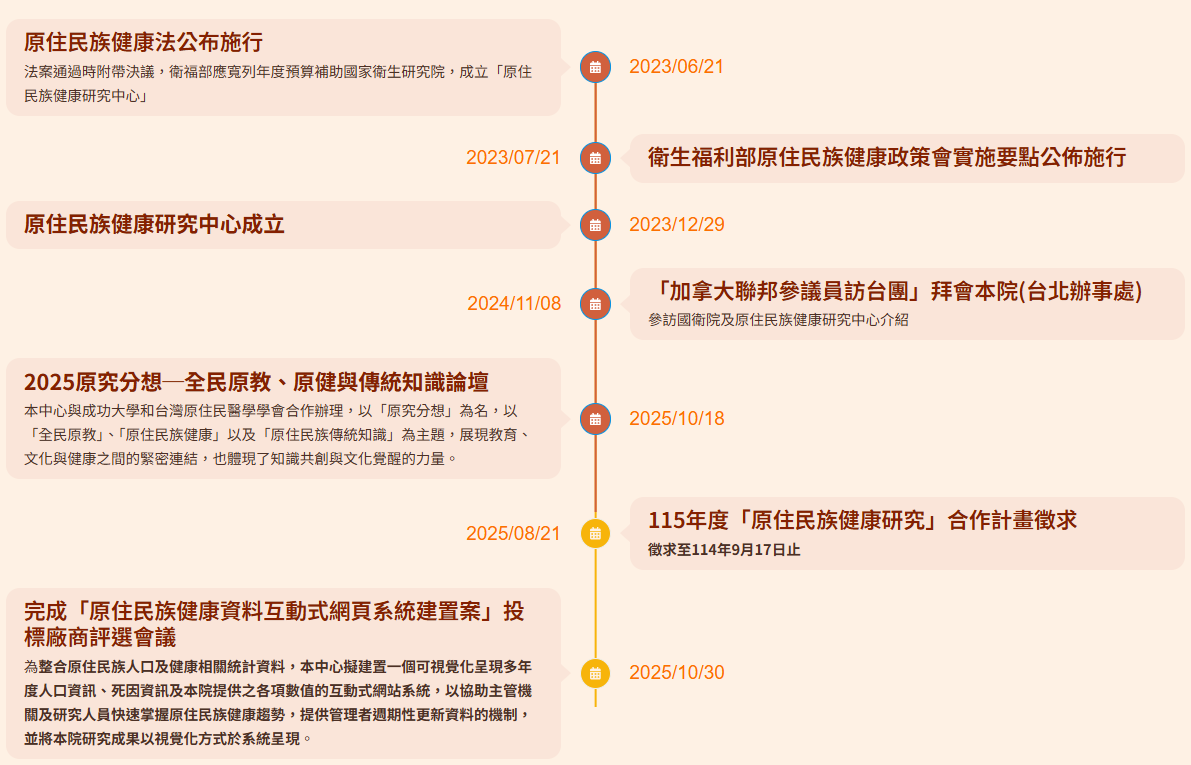 為強化原住民族健康照護,衛生福利部自106年起著手「原住民族健康法」籌備工作,數年來在立法院朝野黨團、公私團體及行政部門的共同努力下,「原住民族健康法」終於112年5月26日由立法院完成三讀、同年6月21日總統公布施行,是我國落實原住民族健康平權、改善醫療照護不平等的重要里程碑。