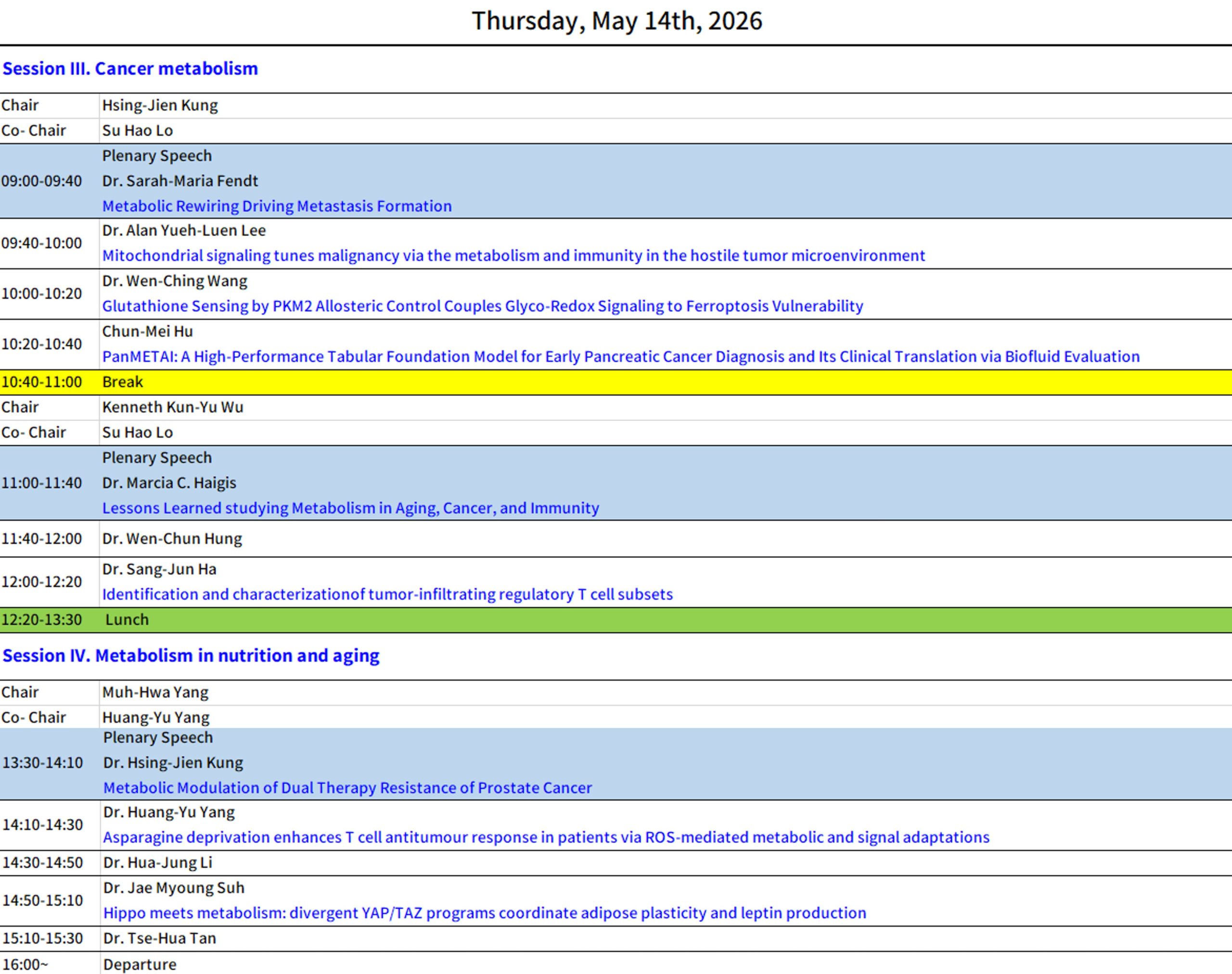 本次會議將於2026年5月13日至14日舉行,涵蓋四大主題:免疫代謝(Immunometabolism)、粒線體功能與疾病(Mitochondrial Function in Disease)、癌症代謝(Cancer Metabolism),以及營養與老化代謝(Metabolism in Nutrition and Aging)。會議匯聚來自台灣、美國、韓國等地之頂尖學者,共同探討代謝醫學領域的前瞻研究。